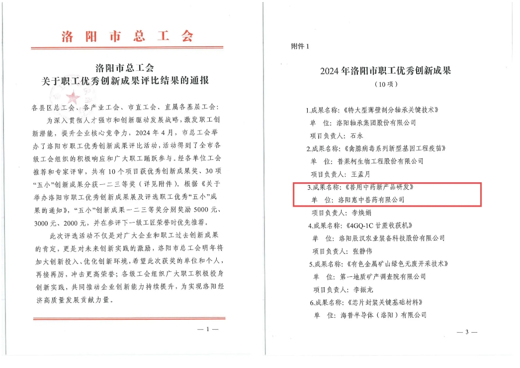 【概要描述】近日,通過洛陽市總工會評選,由惠中獸藥李煥娟帶領公司研發團隊開展的獸用中藥新產品研發項目成果,獲得“2024年洛陽市職工優秀成果獎”。